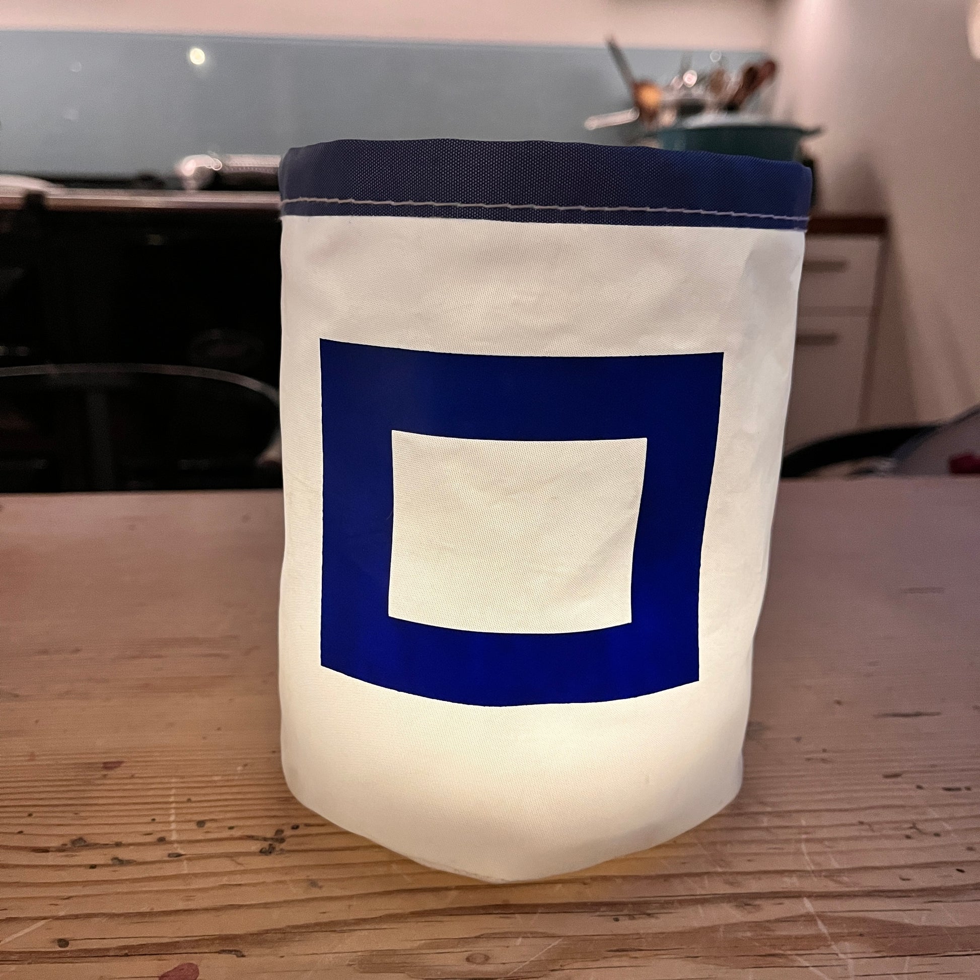 Hva er vel en kveld uten levende lys? Disse lyslyktene er superdekorative og gir et nydelig varmt lys. Lyslyktene er sydd av diverse typer seil. Skaper skikkelig god stemning ut på kvelden, i båten eller på terrassen. Alle lyktene er unike, men jeg kan lage varianter med andre farger og dekor. Husk å sette et glass med telys inn i lykten før du tenner! Eller bruk en lyslenke eller et annet batteridrevet lys. Størrelser 16 cm høye, 13 cm i diameter.