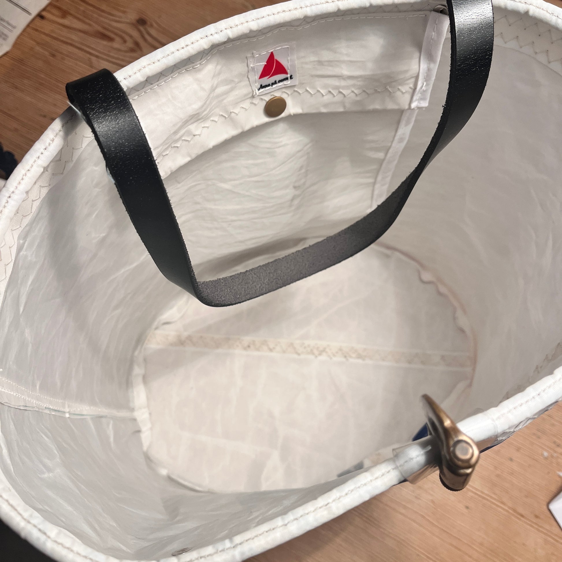 Vesken har oval bunn og er laget av et ganske stivt seil, en Albin Express. Vesken er 30cm bred, og 29 cm høy, og har innerlomme med knapp. Seilet er tykt og ganske stivt, så bagen står fint :-)