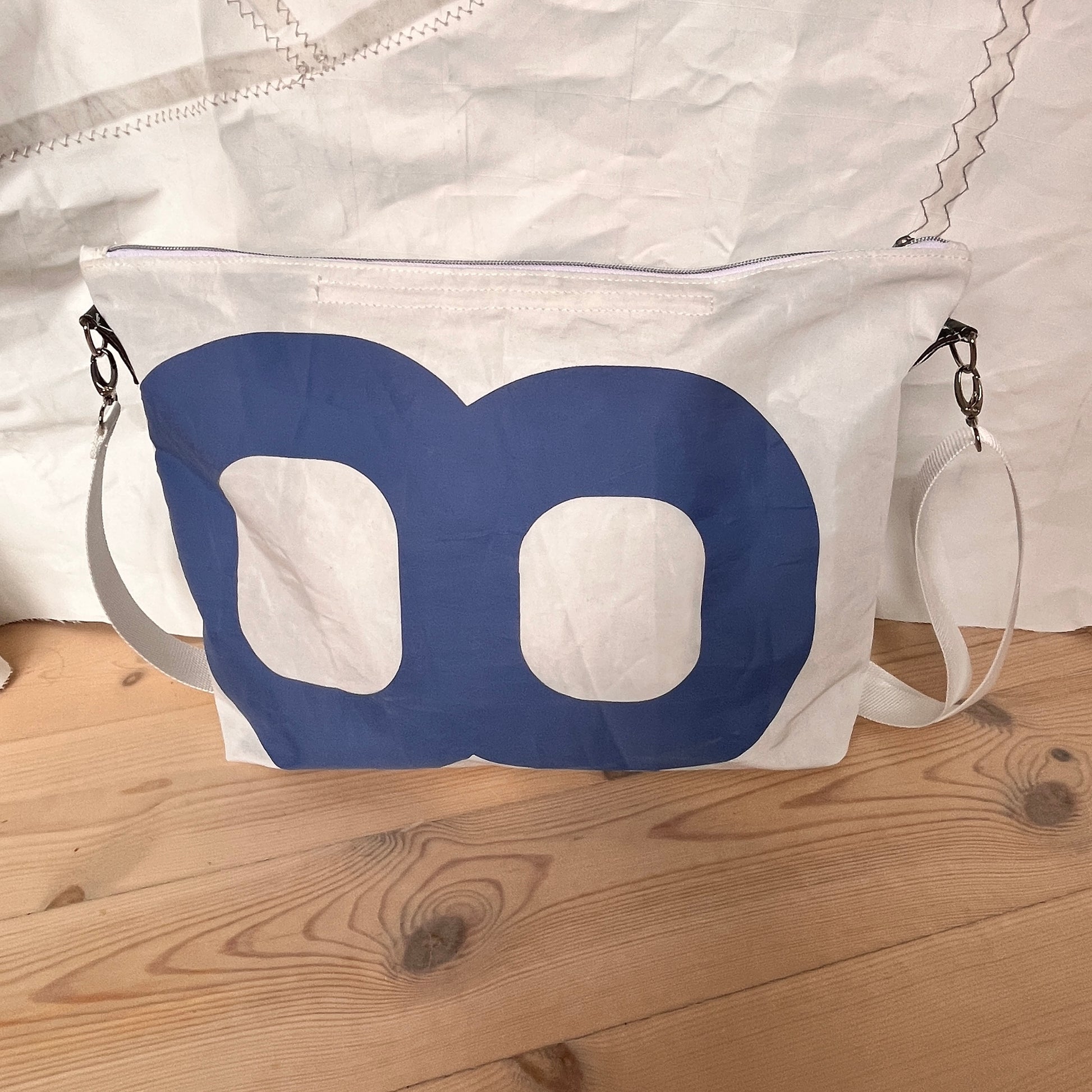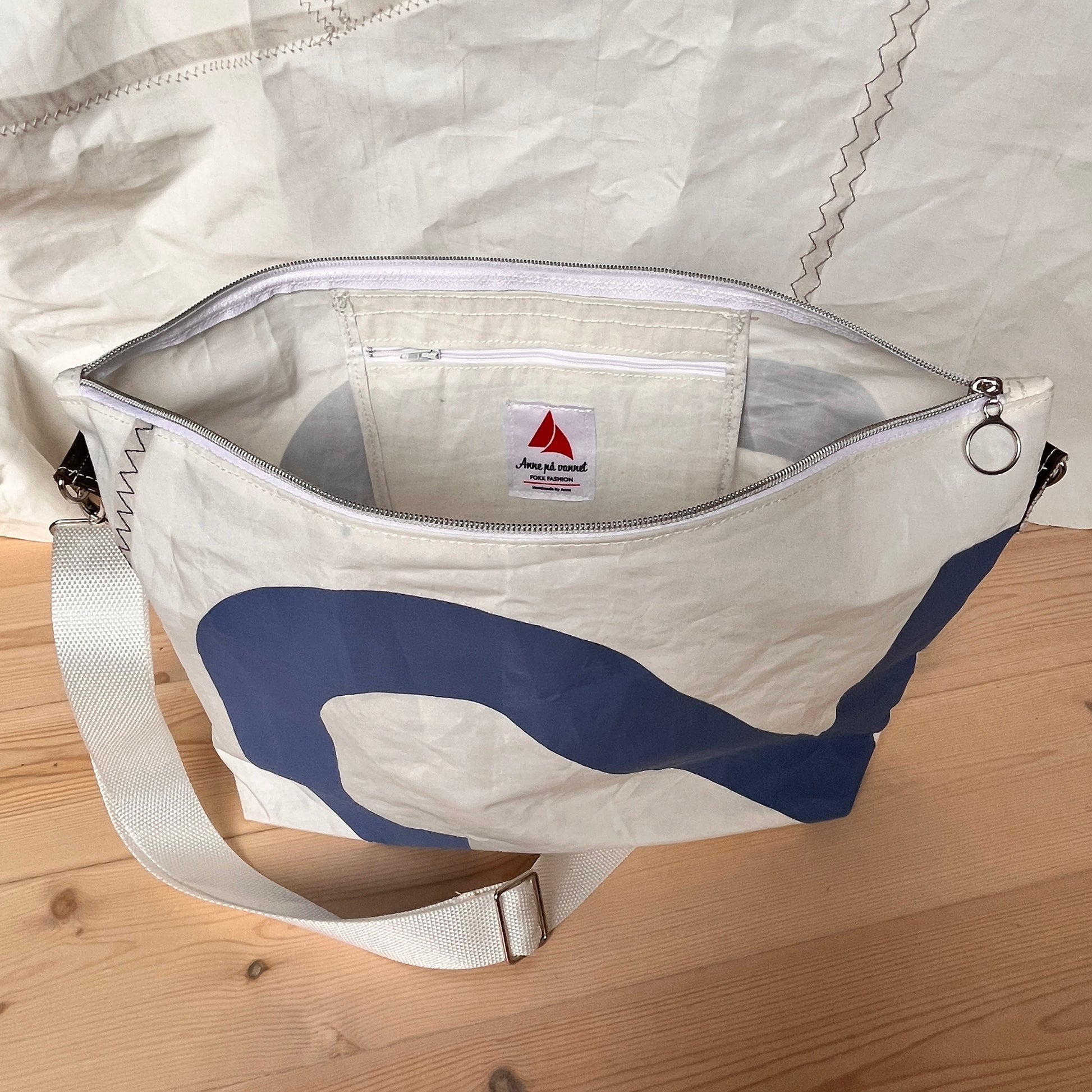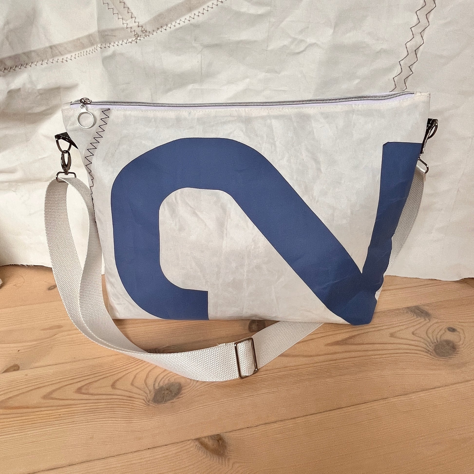 Skulderveske laget av gamle seil. Her får du plass til pc/mac og mere til. Bagen er ca 43 cm bred, 30cm høy og ca 10 cm dyp i bunnen. Justerbar stropp og