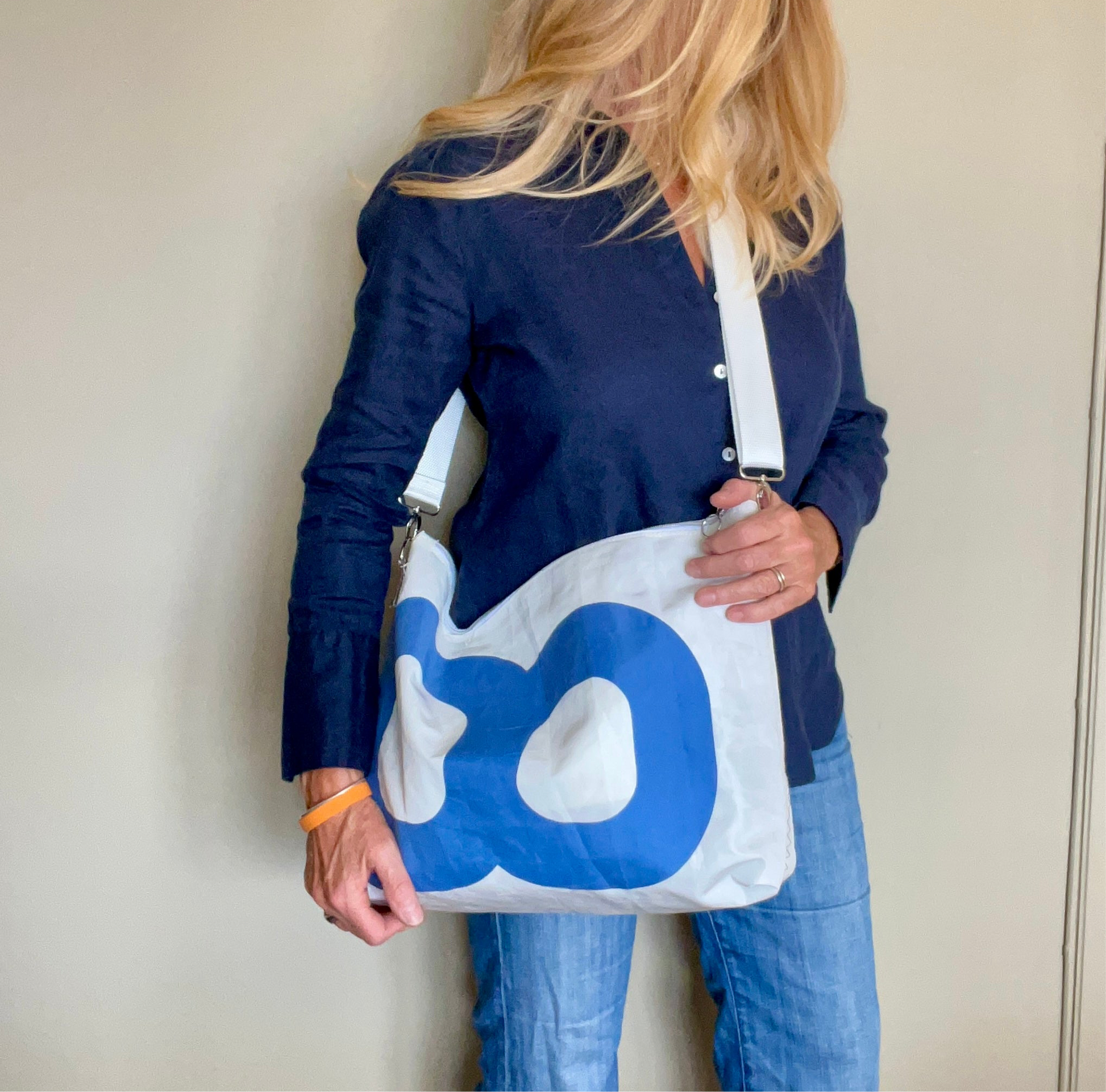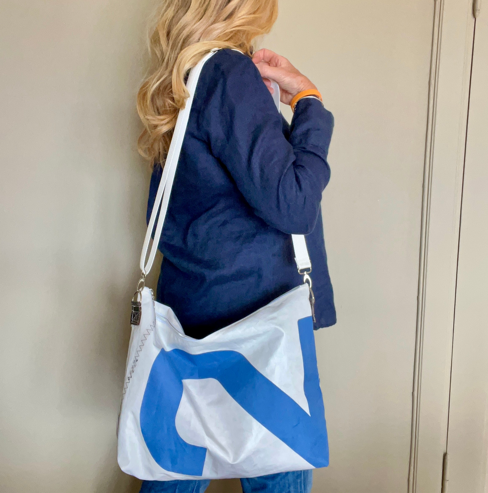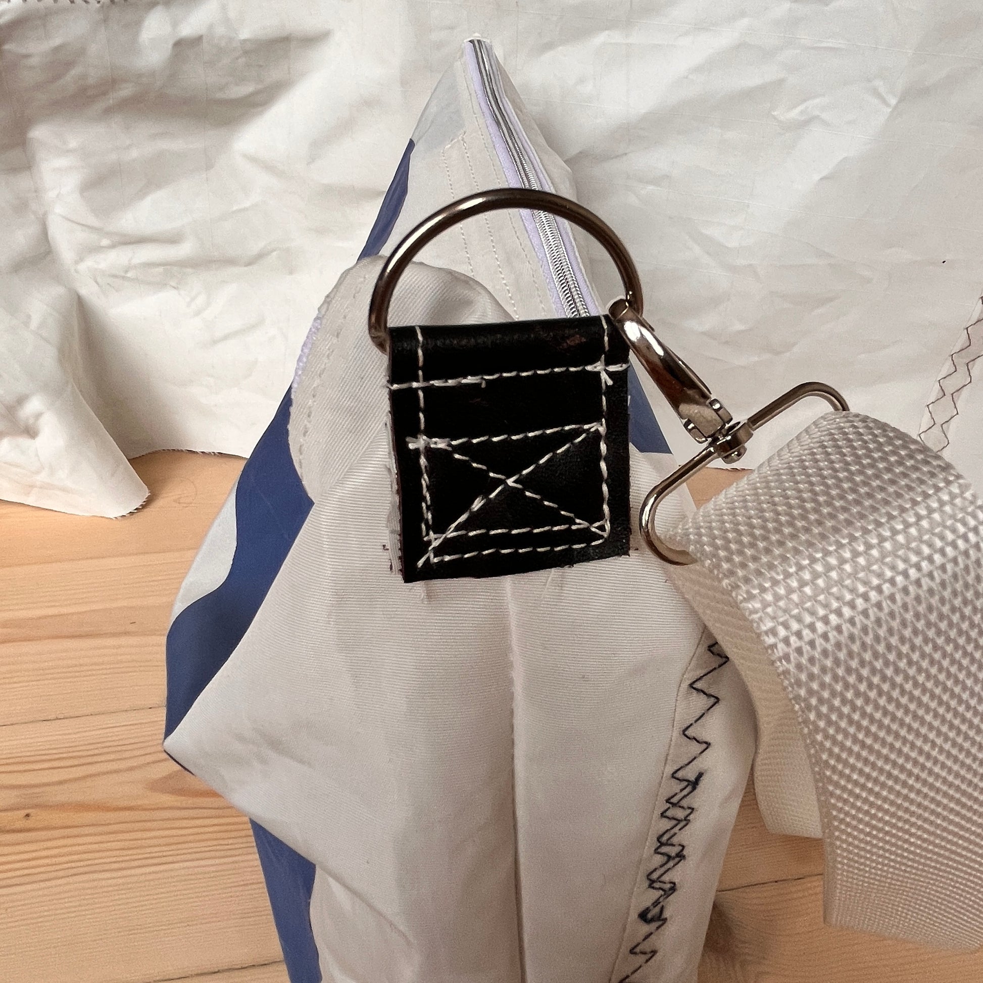 Skulderveske laget av gamle seil. Her får du plass til pc/mac og mere til. Bagen er ca 43 cm bred, 30cm høy og ca 10 cm dyp i bunnen. Justerbar stropp og