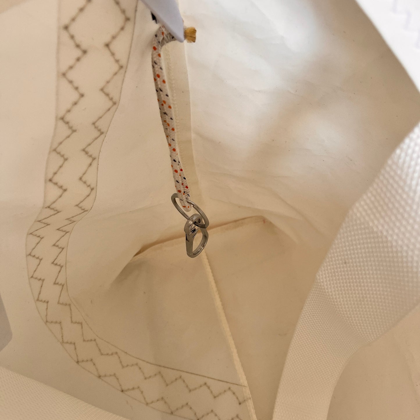 Om seil som materiale. Seil er et sterkt materiale, og de fleste seilene er også veldig lette. Dette gjør produktene lette, men også sterke. Alle seilene er brukt, derfor har de også merker og noen steder kan der være noe misfarging, f.eks. der seilet har "gnagd" mot et stag eller salingshorn. Fargen og strukturen på seilet varierer også, fra kritt hvitt, til mer grålig, eller gullig farge. Jeg tilpasser seilene til typen produkter, så der det trengs myke seil bruker jeg det, og på f. eks. ølbøtte er det fint med tykkere, stivere seil