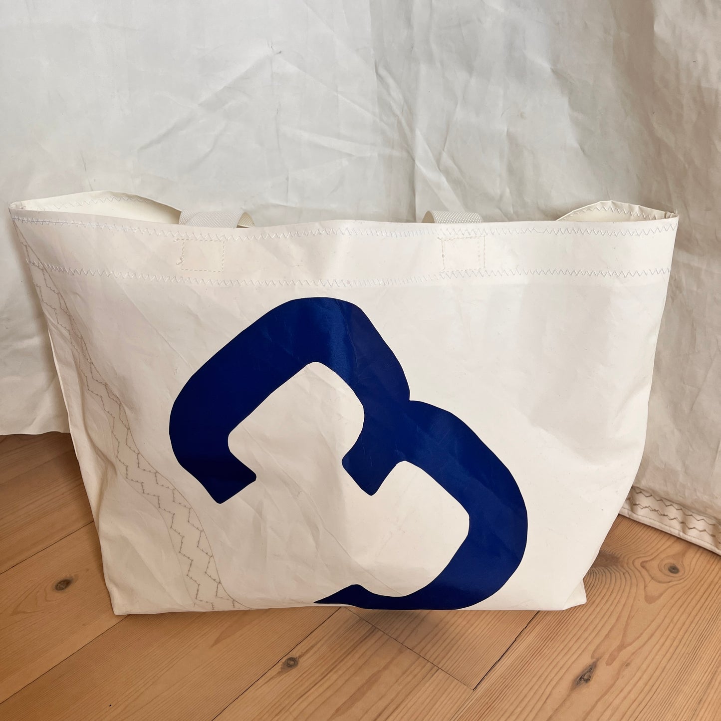 Stor bag som måler 55 x 37cm. 16 cm bredde i bunnen. Lett seil og veier lite i seg selv. Ta den med på handleturen! Eller på stranden, eller hvor du måtte trenge. Stropp med krok så du kan henge en clutch eller annen liten veske.
