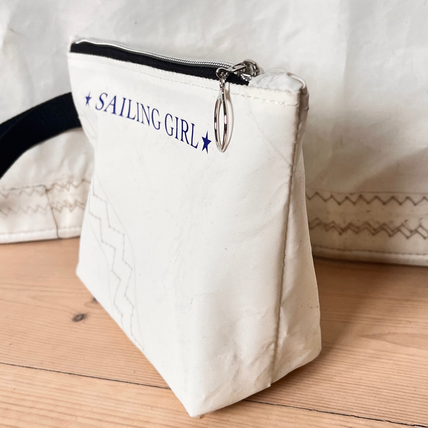 Om seil som materiale. Seil er et sterkt materiale, og de fleste seilene er også veldig lette. Dette gjør produktene lette, men også sterke. Alle seilene er brukt, derfor har de også merker og noen steder kan der være noe misfarging, f.eks. der seilet har "gnagd" mot et stag eller salingshorn. Fargen og strukturen på seilet varierer også, fra kritt hvitt, til mer grålig, eller gullig farge. Jeg tilpasser seilene til typen produkter, så der det trengs myke seil bruker jeg det, og på f. eks. ølbøtte er det fint med tykkere, stivere seil
